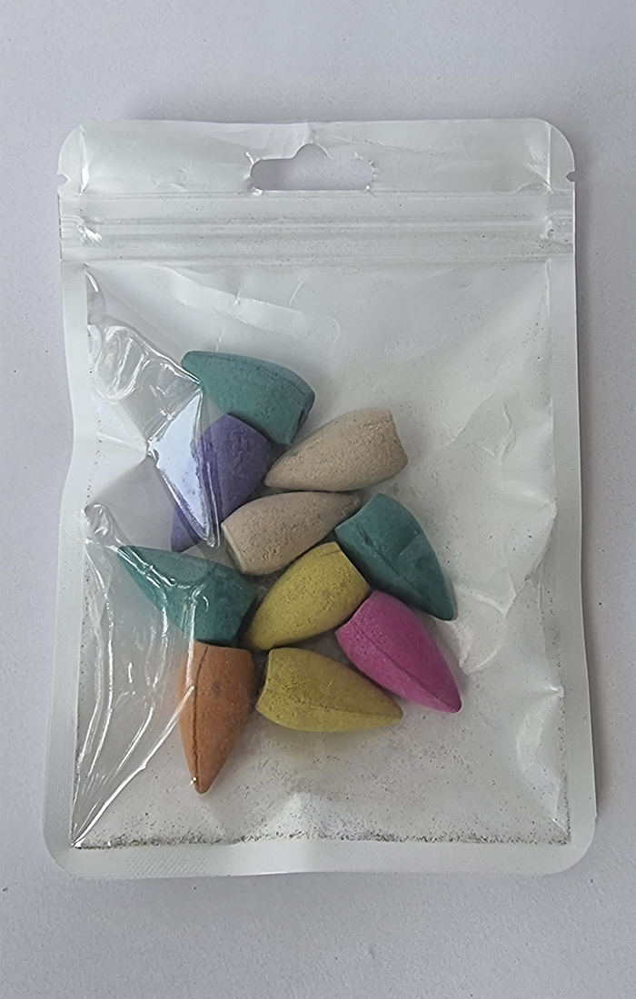 Inciensos de cono. Humo denso y aroma intenso que llena tu espacio en minutos. Ideales para rituales rápidos, limpieza exprés o cuando querés un efecto más fuerte que la varilla. Se usan con porta-conos para cascada.